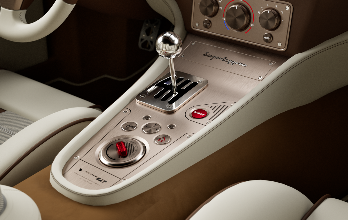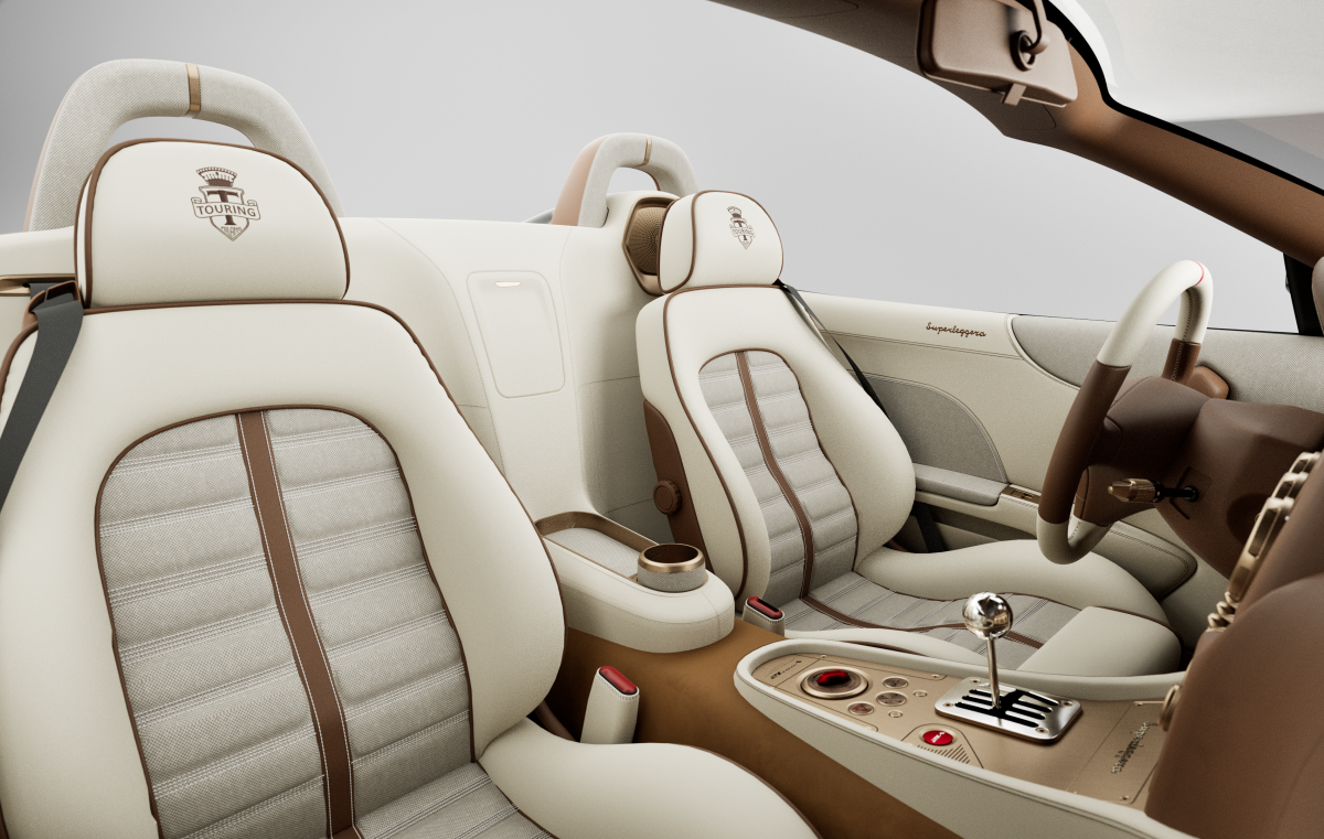 Inside the Superleggera Veloce12 Barchetta, Italian elegance meets the highest expression of craftsmanship. Ergonomic seats, sculpted for both control and responsiveness, are upholstered in the finest Italian leather and natural-fiber fabrics — sourced from esteemed artisanal suppliers known for furnishing the world’s most refined interiors. Every detail is hand-finished, from precise stitching to subtle inlays, reflecting a heritage where excellence is effortless.